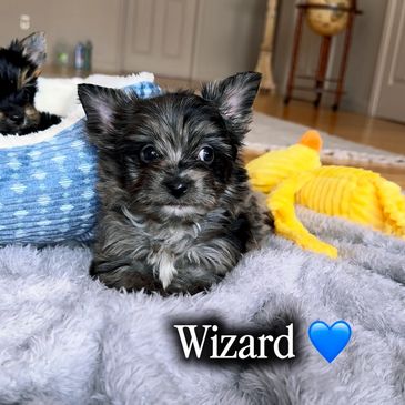 Wizard is a merle yorkie born on 1/1/26 🎉