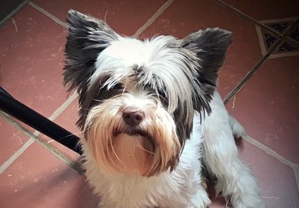 Born into PeacePuppies Pumpkin is from our original lines! She is a black and white Parti Yorkie. She has a beautiful Pumpkin is very athletic, extremely smart, and aware.